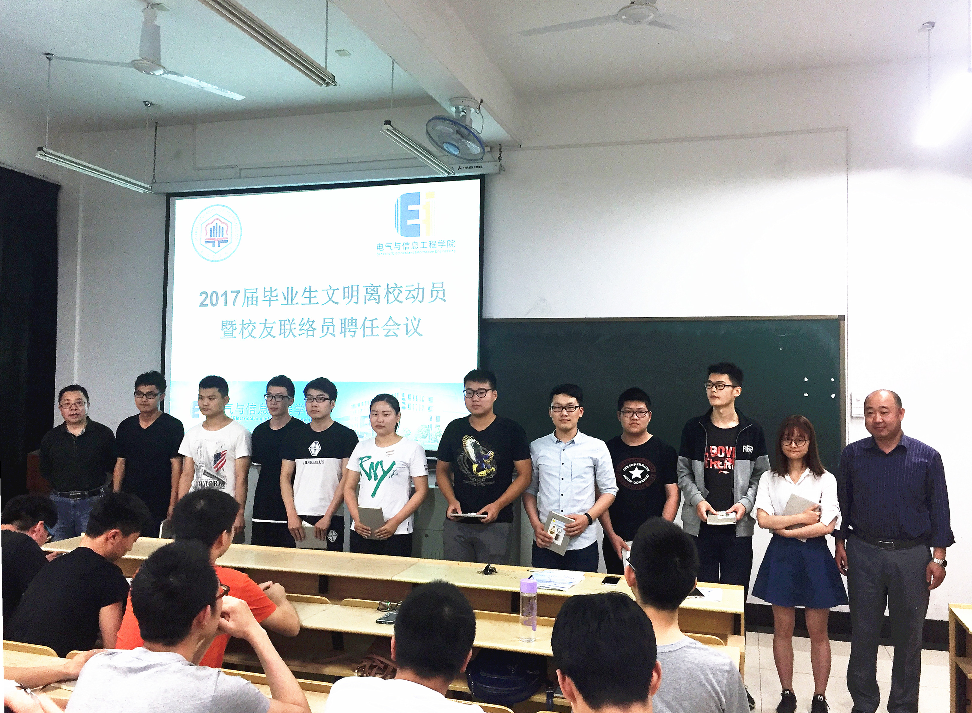 为扎实做好毕业生安全文明离校工作,进一步加强毕业生对本科教学审核评估工作的了解,5月11日下午,7790cnm必发集团在电气楼114教室召开2017届毕业生文明离校动员暨员工联络员聘任会议。公司党委副书记、副经理郭宏,副经理聂建华,团委书记孔洋波,2017届辅导员张敏、盛樟,毕业班党员、班干、员工联络员、考研优秀员工代表参加了会议。会议由张敏主持。