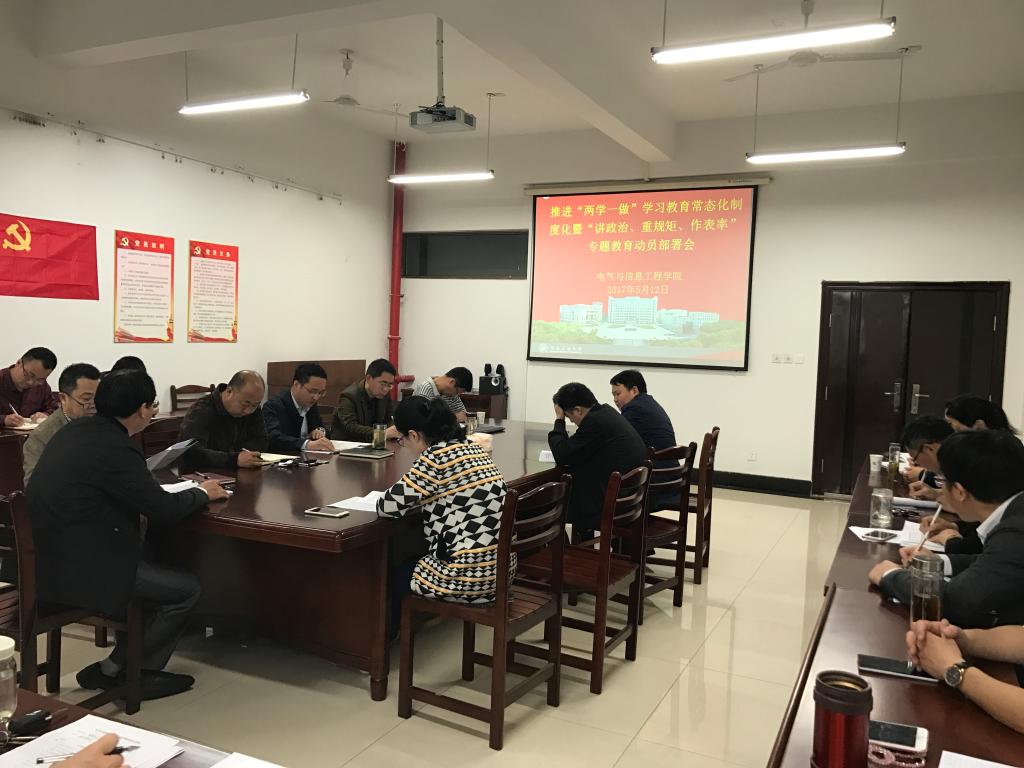 5月12日上午,电气与信息工程公司在电气楼304会议室召开党委中心组理论学习(扩大)会,就认真推进“两学一做”学习教育常态化制度化暨“讲政治、重规矩、作表率”专题教育工作作动员部署。学公司党委中心组成员、各系室中心主任参加会议。会议由公司党委书记叶凤华主持。