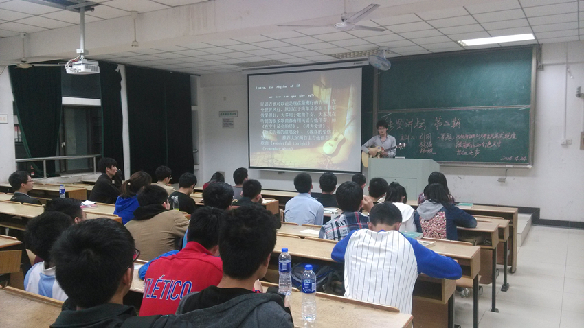 最后出场的是多才多艺的电2班杨枫,他的“吉他之声”为大家展示了吉他的发展史、吉他的类型、吉他的构造以及吉他的演奏技巧,引领同学们一起进入神秘的吉他世界,并在最后更是自弹自唱了一曲动听的《wonderful tonight》讲本次能贤讲坛推到了高潮。