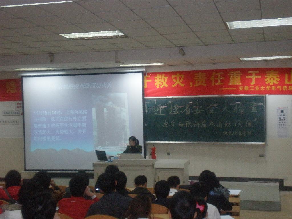 接着马鞍山消防支队汪工程师给同学们上了一堂生动的消防安全知识课。课堂上,汪工程师用生动的语言讲解了如何报火警、火灾的预防、火场自救及逃生方法等消防安全基本常识,并针对当前公司的消防安全工作形势和火灾特点,向员工讲解了用火、用电注意事项,强调一旦身边发生突发事件,要沉着应对,做好安全逃生工作,使同学们受益匪浅。讲座过程中,同学们都在专心倾听并认真做笔记,讲到相关话题时,积极参与讨论,踊跃发言,现场气氛十分活跃。