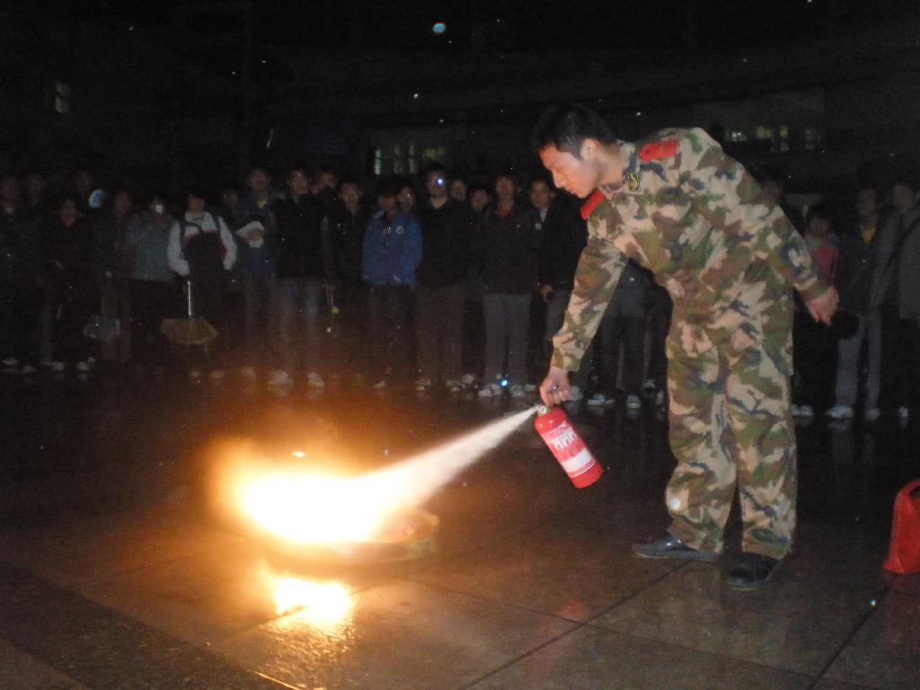 讲座之后,辅导员和班长、宿舍长代表在“隐患险于明火,防范胜于救灾,责任重于泰山”横幅上承诺签名。签名之后,市消防支队袁班长组织员工进行了实际使用灭火器扑救火灾的操作演练,使同学们掌握了正确使用灭火器的方法。