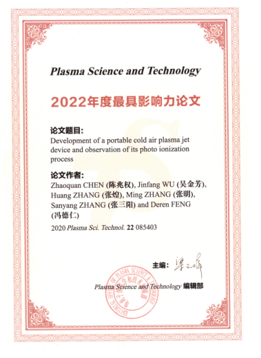 公司三名教师参加了会议,其中,陈兆权教授受邀作了题为“大微波瑞利散射测定等离子体射流的电子密度及其时空演化”的邀请报告,引起了与会专家和学者的热烈讨论与积极反响。陈思乐老师作了题为“大气压微波碳氟等离子体源研制”的口头报告。会议期间,与会教师们与等离子体物理学相关领域的专家们积极交流、深入探讨、受益匪浅。闭幕式上,《Plasma Science and Technolgy》期刊颁发了“2022年度最具影响力论文”奖,陈兆权教授的论文“Development of a portable cold air plasma jet device and observation of its photo ionization process”荣获此奖项。