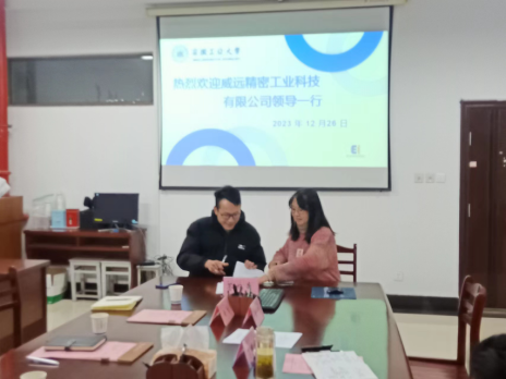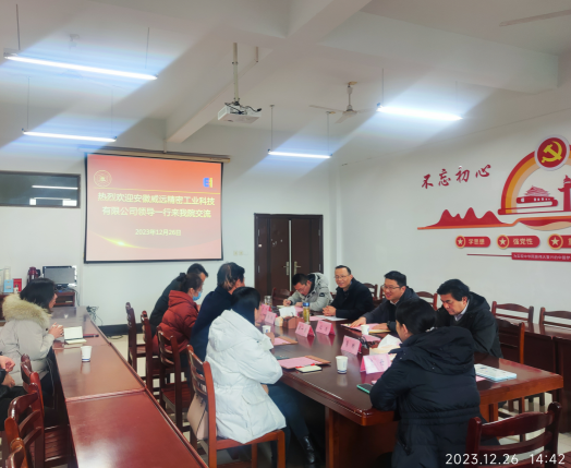 12月26日,安徽威远精密工业科技有限公司开展产学研合作交流,公司董事长李一前、设备工艺经理徐金、商务经理葛晴、人事科长朱敏、公司党委书记丁忠利、经理沈浩、副书记李克明、副经理李飞、测控系主任李丹、青年博士钱牧云参加对接活动。