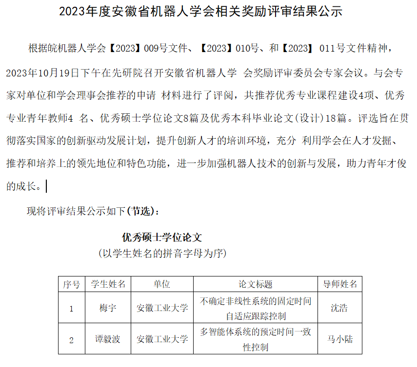 【电院荣光】公司硕士学位论文获2023年度安徽省机器人学会优秀硕士论文