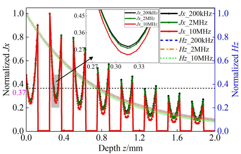 (不同的铺层顺序(左)、激励源形状与电各向异性(中)和激励频率(右)下电磁场量的分布情况)