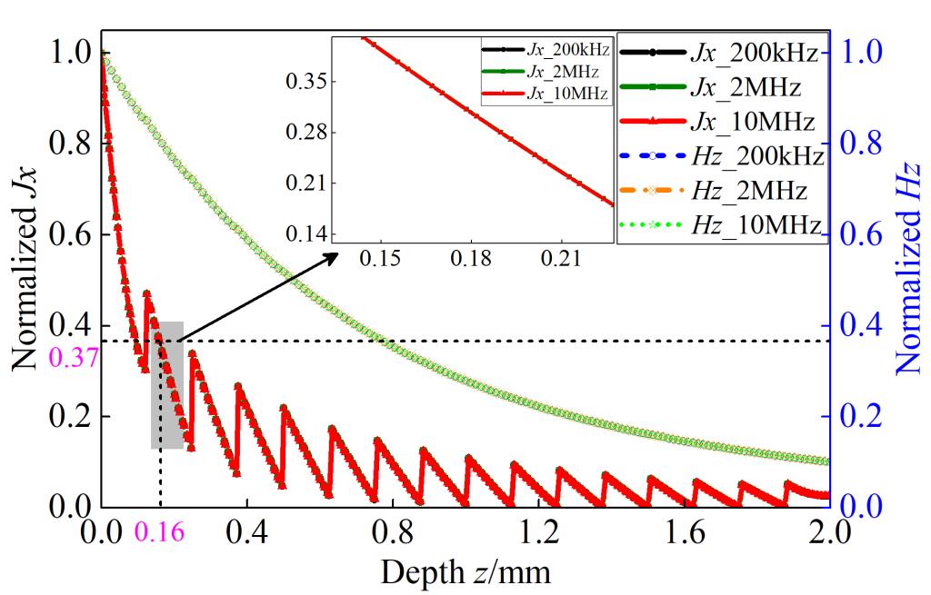 (电磁场分量在碳材料(左)、CFRP单向板(中)和CFRP正交板(右)厚度方向的衰减)