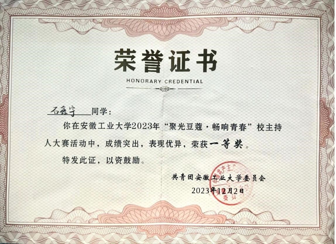 【电院荣光】公司石鑫宇同学荣获校主持人大赛一等奖
