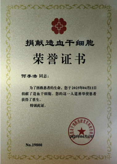何李浩是公司2023级电子信息专业的员工,2023年10月刚入学后不久,何李浩在参加校园无偿献血活动中了解到捐献造血干细胞救助他人的意义后,毅然留样加入中华骨髓库,留下当代老员工的大爱精神和青春担当,而这份爱心的实现在大家共同的努力下,一年半后就开花结果。